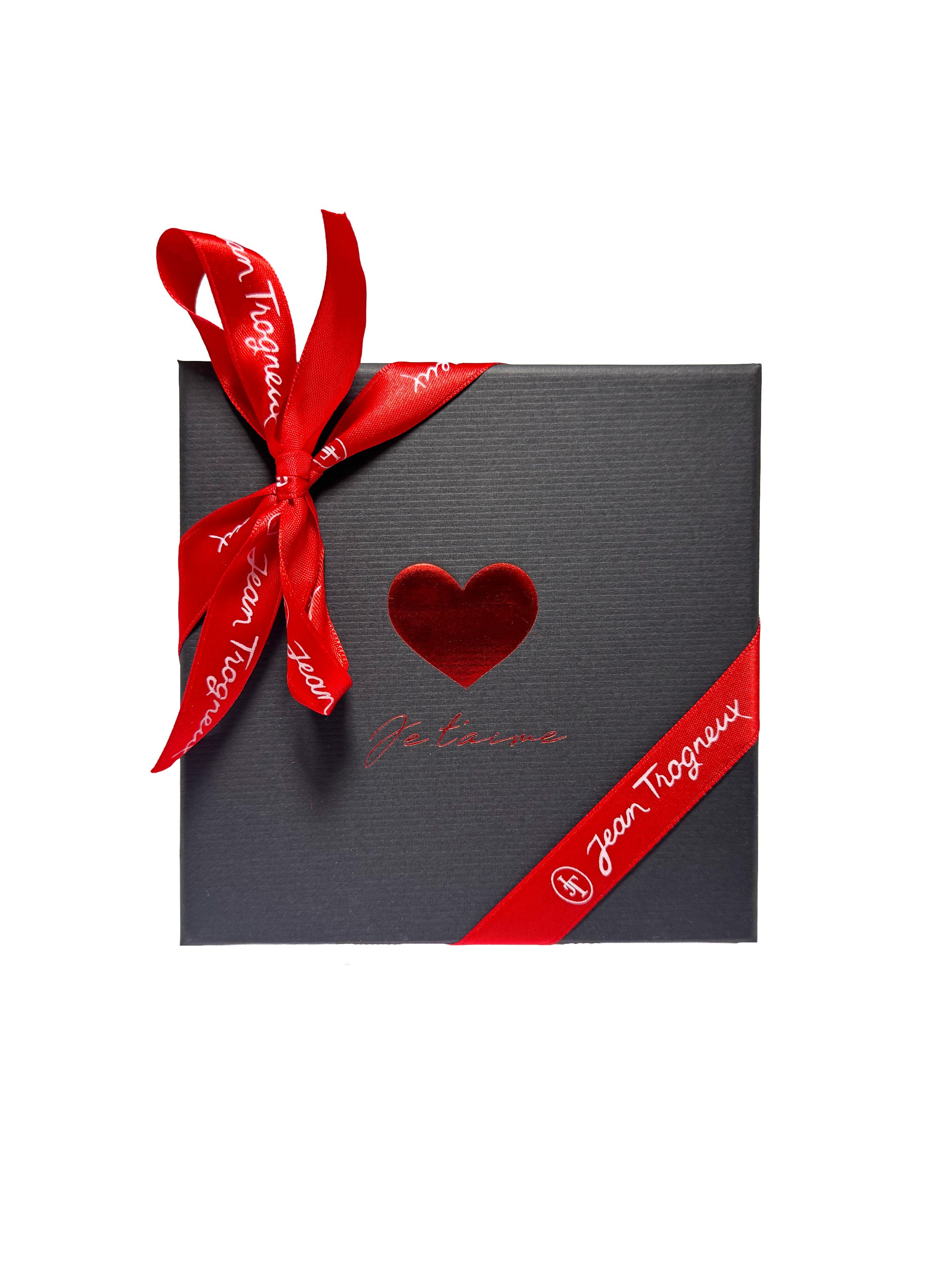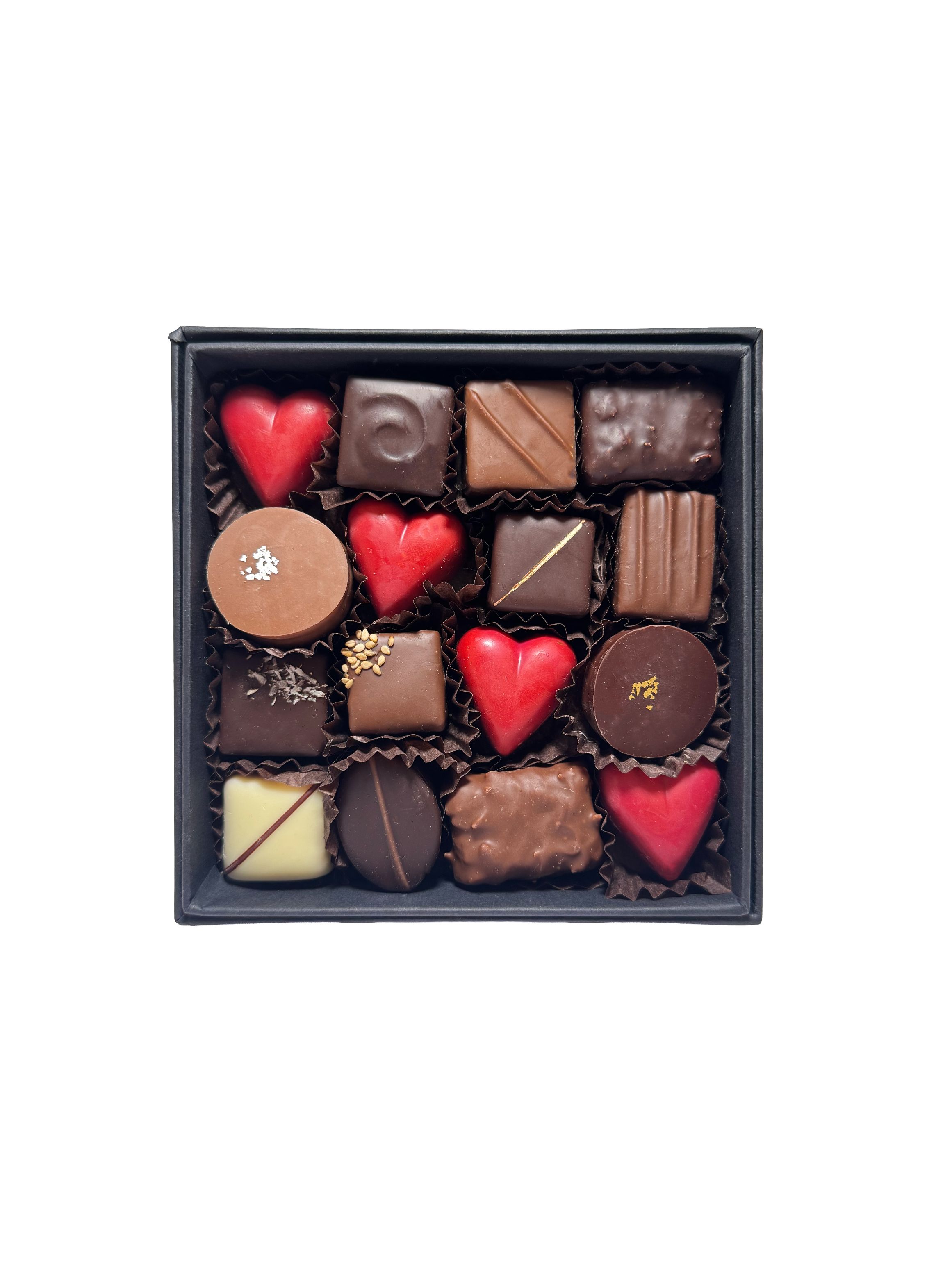 Boite garnie de 12 chocolats et 4 coeurs praliné