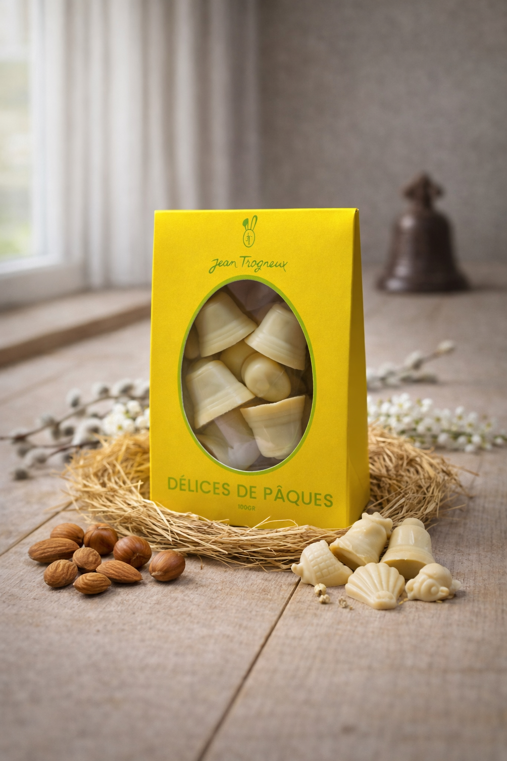 Cloche blanche.Bonbon de chocolat blanc fourré au praliné amande noisette Poids net :100grs