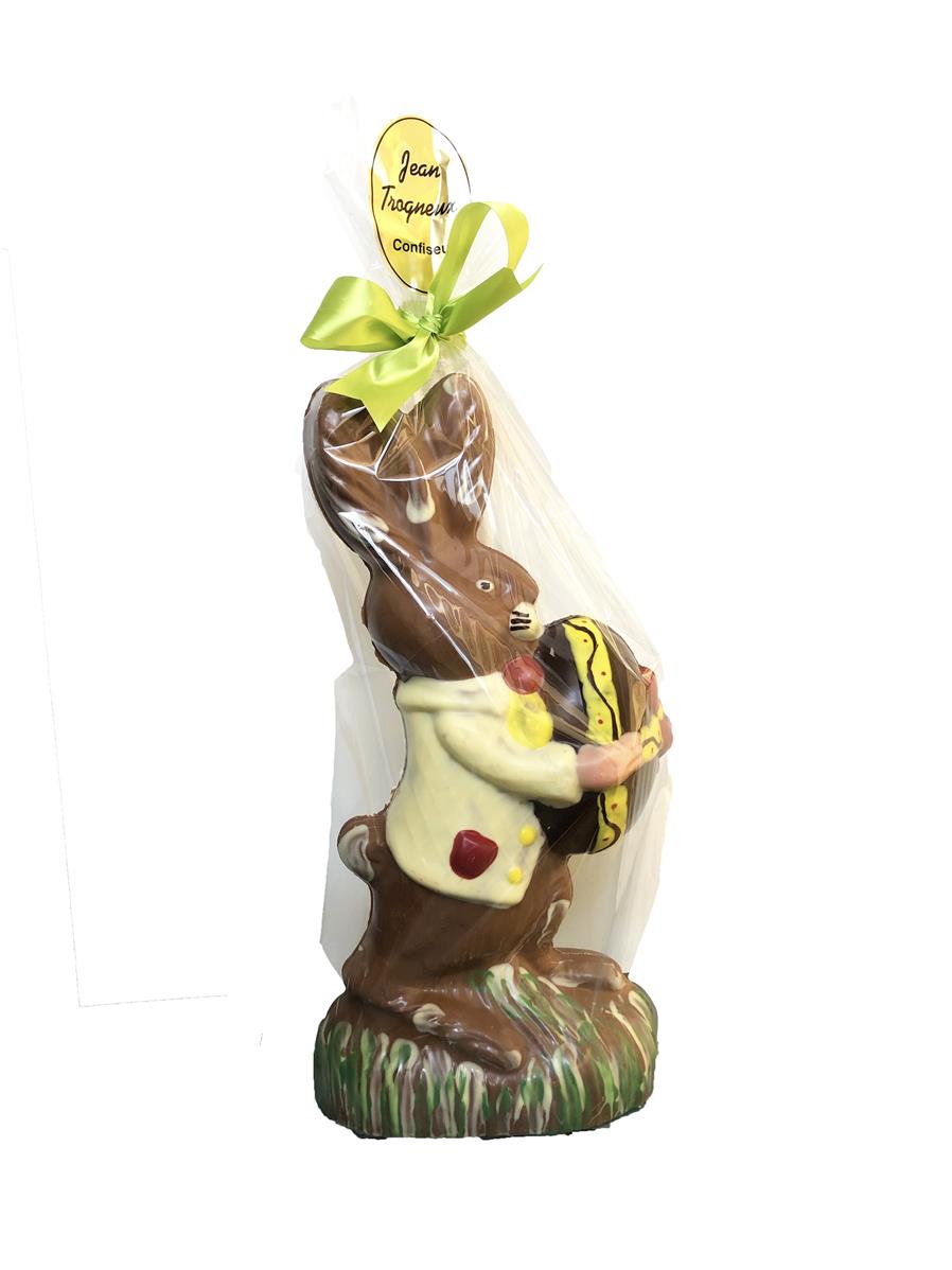 Le Maxi Lapin Oeuf, moulage décoré en chocolat noir ou lait (900gr env)