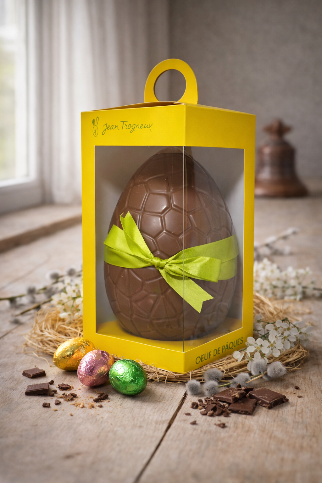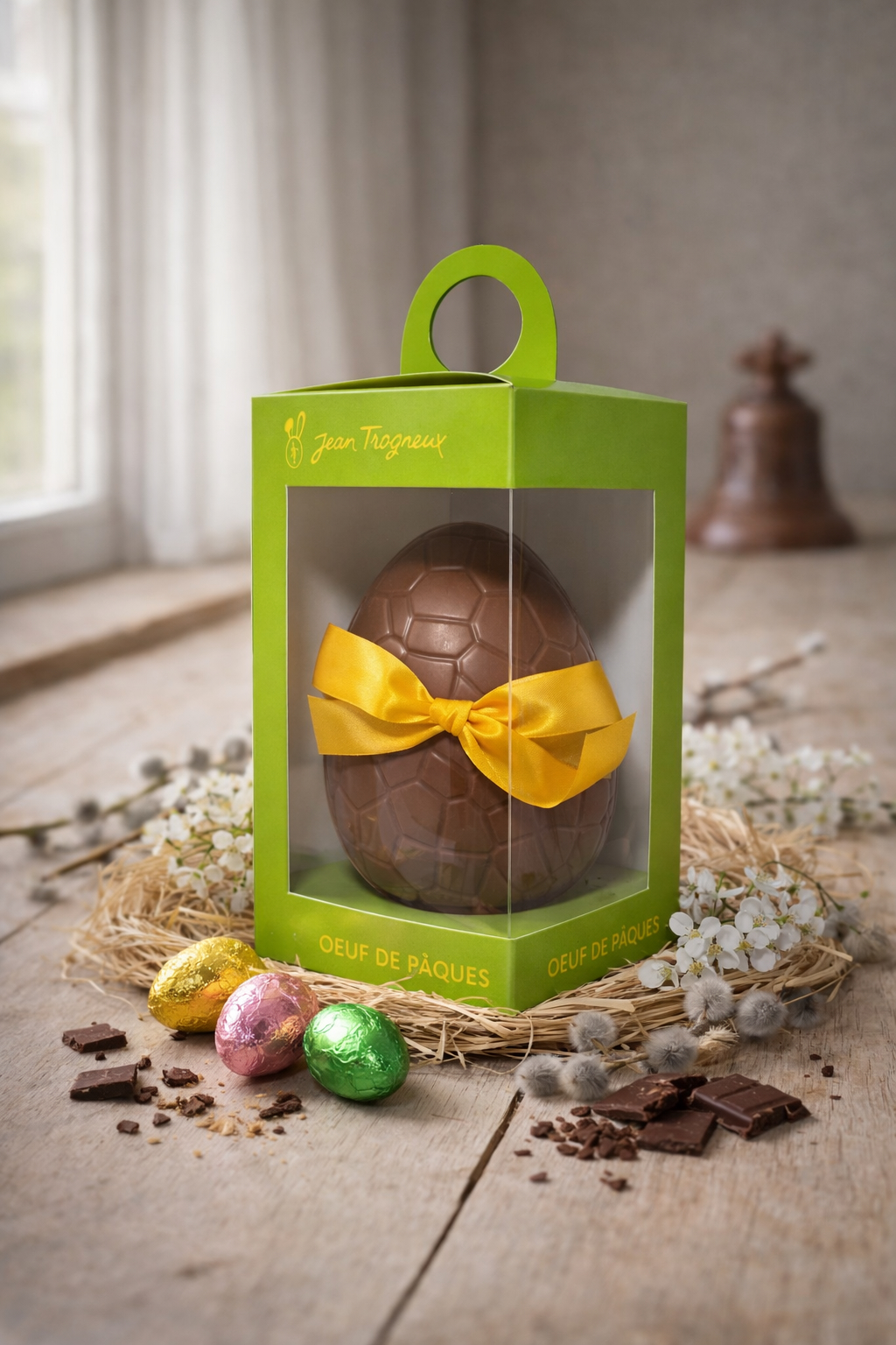 chocolat de couverture au lait (sucre, beurre de cacao, poudre de lait entier pâte de cacao, émulsifiant: lécithine de soja, arôme naturel de vanille), Teneur en cacao :33.9 % min , chocolat de couverture noir (pâte de cacao, sucre, beurre de cacao, émulsifiant : lécithine de soja) Teneur en cacao : 56.9 %. Œufs feuilletés pralinés multicolore Assortiment de confiseries au praliné enrobées de chocolat blanc, lait et noir et décor coloré. Ingrédients: sucre, sirop de glucose, beurre de cacao, poudre de lait entier, praliné (9.9%), (sucre, noisette 25%, amande 25%). Emulsifiant : lécithine de soja, arôme naturel de vanille avec autres arômes naturels, colorants : extrait naturel de carotte, E160c, E120, E141i, agents d'enrobage : gomme arabique, gomme laqué. Sujets fondants : Sucre, sirop de glucose, arômes naturels et vanilline, colorants : E120 E131 E160c , E161b, sulfites (glucose) traces possibles de fruits a coques et d'albumine d'oeuf. bonbon de chocolat praliné/gianduja. Œuf sous alus chocolat de couverture foncée, de couverture lait, gianduja et praliné. sucre, graisse végétale (palmiste, palme), pâte de cacao, beurre de cacao, poudre de lait entier, lactosérum en poudre, lactose, cacao maigre en poudre, praliné 1% (sucre, pate de noisettes), amandes, noisettes, émulsifiant: lécithine de soja et de tournesol E476 arômes : poudre de lait écrémé, farine de riz, de blé, gluten de blé, de malte de blé, dextrose et sel, naturel de vanille. Valeurs nutritionnelles pour 100g : Energie kJ / kcal : 2330 / 558, Matières grasses (g) : 33, Dont acides gras saturés (g) : 20, Glucides (g) : 60, Dont sucres (g) :59, Protéines (g) : 4.3, Sel (g) : 0.14