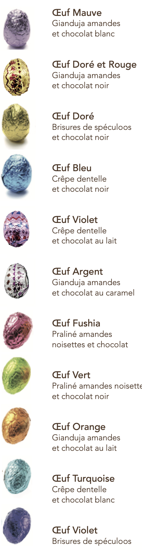 Œuf Bonbon de chocolat lait : gianduja avec éclats d'amandes enrobé de chocolat de couverture au lait Poids net : 100grs Ingrédients :Chocolat au LAIT et aux NOISETTES , gianduja 44% (sucre, NOISETTES, beurre de cacao, poudre de LAIT entier, pâte de cacao, émulsifiant : lécithine de SOJA), crème de NOISETTE chocolat de couverture au LAIT (sucre, beurre de cacao, poudre de LAIT entier, pâte de cacao, émulsifiant : lécithine de SOJA, arôme naturel de vanille), éclats d'AMANDES 10,6%, BEURRE.*Enrobage chocolat au lait : cacao 33% minimum Traces possibles d'allergènes : sésame, fruits à coque, céréales contenant du gluten, sulfites, lait et produits à base de lait,d'œufetdesoja.Informationsnutritionnellespour100G Energie:2624kj/631 kcal Matières grasses:51g dont acides gras saturés:17g Glucides:28g dont sucres:27g Protéines: 11g Sel:0.11g